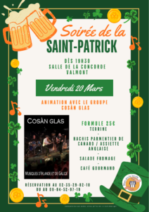 Soirée de la Saint-Patrick à Valmont Dès 19h30, salle de la concorde. Animation musicale, restauration (formule à 25€). Réservation au