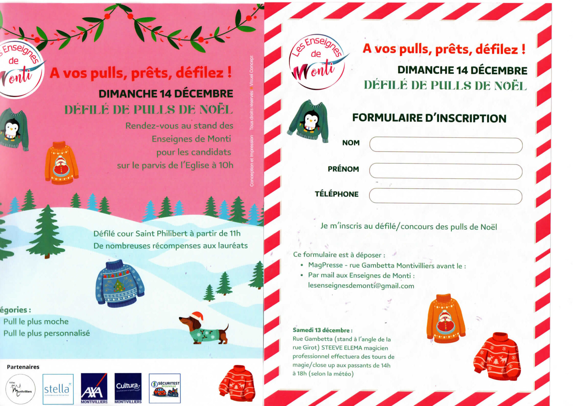 Venez nombreux participer au défilé de pulls de Noël dimanche 14 décembre à Montivilliers, Cours Saint Philibert à partir de 11h00. 2 catégories : Pull le plus moche et pull le plus personnalisé. Pour les candidats, un formulaire d'inscription est joint. RV au stand des enseignes de Monti sur le Parvis de l'église à 10h00. […] |